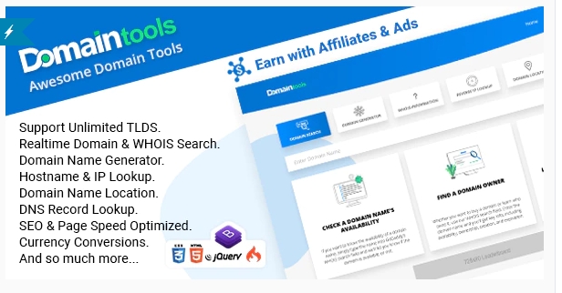 DomainTools - это мощный скрипт на основе PHP, который состоит из множества замечательных инструментов домена и IP. Он позволяет мгновенно искать доменные имена. Он имеет встроенный инструмент домена whois, инструмент генератора доменов, инструмент поиска имени хоста и IP, инструмент записи DNS домена. Он построен с полностью адаптивным дизайном на основе последней версии Bootstrap, чтобы ваш веб-сайт выглядел абсолютно безупречно и красиво на любом мобильном и настольном устройстве. Он также имеет сильную кроссбраузерную поддержку. Он проверяет доступность домена, выполняя DNS-запрос, чтобы получить результаты поиска как можно быстрее. Вы зарабатываете деньги, когда кто-то покупает доменные имена по одной из ваших партнерских реферальных ссылок. Вы также можете зарабатывать через Google AdSense или аналогичные платформы.